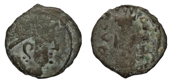 HUNNIC TRIBES, KHANATE OF THE WESTERN TURKS: The Lord Yabghu, ca. 560-585, AE unit ( 1.21 g). (Z’WL) Tokharestan mint. bust right / fire-altar and flames, flanked with Sogdian legend, Mitch-1545, VF, RR. *The bactrian legend to the right of the fire-altar reads: "?opo" (Phoro). The legend point to the turk ruler who called himself "Phromo Cesaro". He was perhaps a vasall of the Turk Shahi king Shahi Tegin, and was ruling about AD 700 or slightly later... |
