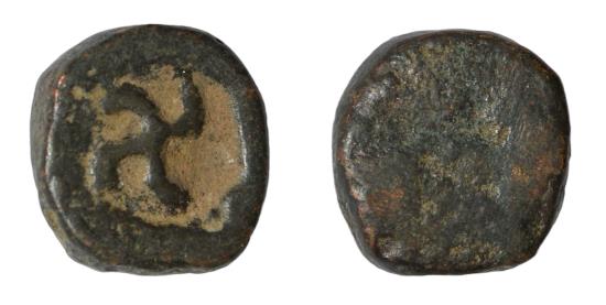 AE Unit (2.73 g), Taxila city state (Pushkalavati), circa 1st century BC. Swastika turning right in round incuse.