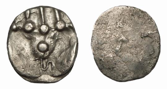 (2.10 g), circa 600-700. with only One character " HA " (in Brahmi) below group of pellets above one pellet.