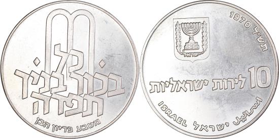 | | Coin, Israel, 10 Lirot, 1970, Jerusalem, , Silver, KM:56.1 | | | Menorah flanked by sprigs at upper left of text, Text among the letter M flanked by diamonds | | FEATURES |