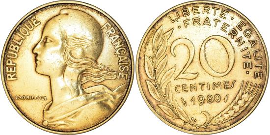 | | Coin, France, Marianne, 20 Centimes, 1980, Paris, , Aluminum-Bronze | | | Marianne, Liberty bust left, Denomination above date, grain sprig below, laurel branch at left, Without mint mark. 1991-1993 dated coins, non-Proof, exist in both coin and medal alignment., Henri Lagriffoul | | FEATURES |
