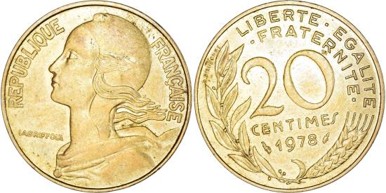 | | Coin, France, Marianne, 20 Centimes, 1978, Paris, , Aluminum-Bronze | | | Marianne, Liberty bust left, Denomination above date, grain sprig below, laurel branch at left, Without mint mark. 1991-1993 dated coins, non-Proof, exist in both coin and medal alignment., Henri Lagriffoul | | FEATURES |