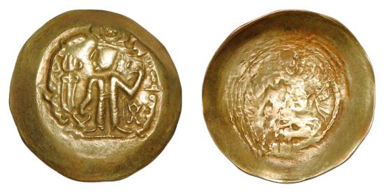 HUNNIC TRIBES, Alchon Huns. Adomano, circa 450-500. AV Dinar (7.08 g). Baktria Mint. αδομανο μιιροσανο?αο ('Adomano, King of the East' in Bactrian) King standing front in Kushano-Sasanian style figure, head to left, wearing crenellated crown with globe on top between two broad horizontally-pleated ribbons and holding trident in his left hand; to left, trident above small altar; to right, tamgha. Rev. Ardoxsho enthroned facing (largely indistinct). Alram, Alchon 29, Göbl 85 (Khingila). Vondrovec, Type 85. A well centered example. Very fine. |