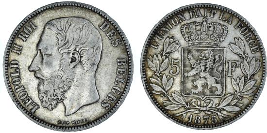 | | Coin, Belgium, Leopold II, 5 Francs, 5 Frank, 1875, , Silver, KM:24 | | | Smaller head, engraver's name near rim, below truncation, Crowned arms on ornate shield divide denomination, wreath surrounds, LEOPOLD II ROI DES BELGES | | FEATURES |