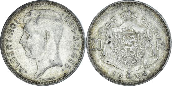 | | Coin, Belgium, 20 Francs, 20 Frank, 1934, Brussels, , Silver, KM:104.1 | | | Head of Albert, left, legend in Dutch, Crowned arms divide denomination and date, Position A., DER BELGEN | | FEATURES |