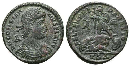 Obv/ Pearl-diademed, draped and cuirassed bust right; A behind. D N CONSTANTIVS P F AVG.