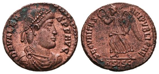 VALENTINIAN I. Ae, Follis. AD 364-367. Siscia mint. ·ASISC. SECVRITAS REI PVBLICAE, Victory advancing left with palm.