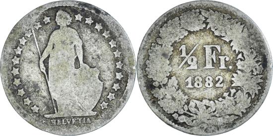 | | Coin, Switzerland, 1/2 Franc, 1882, Bern, , Silver, KM:23 | | | Standing Helvetia with lance and shield within star border, Value, date within wreath | | FEATURES |