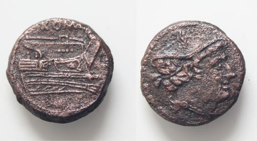 | Anonymous, circa 217-215 BC. Semuncia (Bronze, 20 mm, 6.34 g, 8 h), Rome. Head of Mercury to right, wearing winged petasos. Rev. ROMA Prow to right |