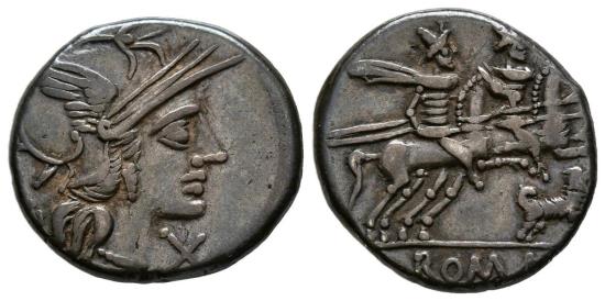 | ACUÑACIONES ANONIMAS. Denario. (Ar. 3,81g/18mm). 200-195 a.C. Roma. (FFC 49; Crawford 122/2). Anv: Cabeza de Roma a derecha, delante X. Rev: Dioscuros sobre caballo a derecha, enc |
