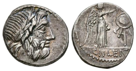 GENS CORNELIA. Quinario. (Ar. 1,96g/14mm). 88 a.C. Roma. (RIC 345/2). Anv: Cabeza laureada de Júpiter a derecha. Rev: Victoria estante coronando escudo a derecha, debajo leyenda: CN LENT. EBC-.
