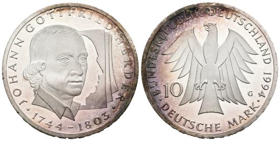 GERMANY. 10 Mark (Ar. 15.49g/33mm). 1994. Karlsruhe G. 250th Anniversary of the birth of Johann Gottfried Herder. (Km#184). Good Extremely Fine. Fine lines.