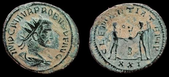 Probus, AE Antoninianus. 276-282 AD. 21mm. 3.71g. Antioch mint. IMP C M AVR PROBVS P F AVG, radiate, draped and cuirassed bust right / CLEMENTIA TEMP, emperor standing right, holding eagle-tipped sceptre and receiving Victory on globe from Jupiter standing left, holding sceptre. B in lower centre. Mintmark XXI. RIC V-2 Antioch 922; Sear 11961; Cohen 99. Very Fine. Beautiful patina.