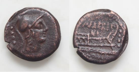 | Roman Republic M. Fabrinius, Rome, 132 BC. Æ Triens (18,5mm, 4,89g, ). Helmeted head of Minerva r. R/ Prow of galley |