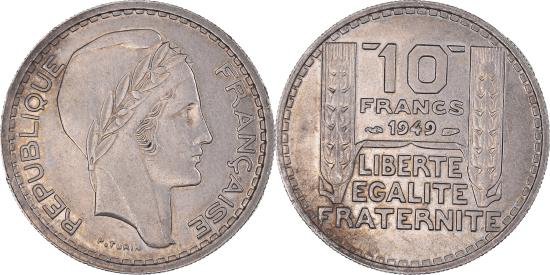 | | Coin, France, Turin, 10 Francs, 1949, Paris, , Copper-nickel, KM:909.1 | | | Turin, Laureate head right, small head, Denomination above date, inscription below, grain columns flank, Without mint mark. | | FEATURES |