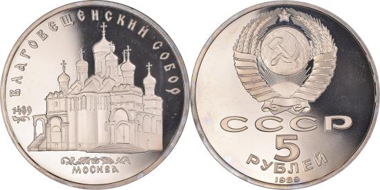 | | Coin, Russia, 5 Roubles, 1989, Leningrad, Proof, , Copper-nickel | | | National arms with CCCP and value below, Cathedral of the Annunciation in Moscow | | FEATURES |