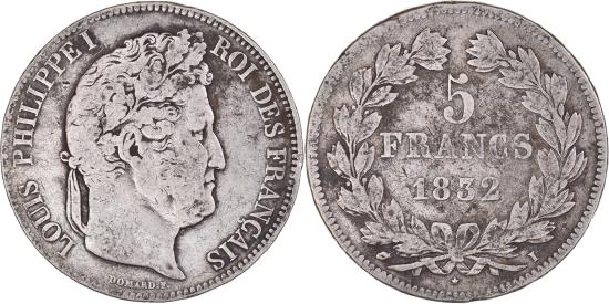 | | Coin, France, Louis-Philippe, 5 Francs, 1832, Limoges, , Silver | | | Louis-Philippe, Laureate head right, Mint marks at edge outside wreath | | FEATURES |