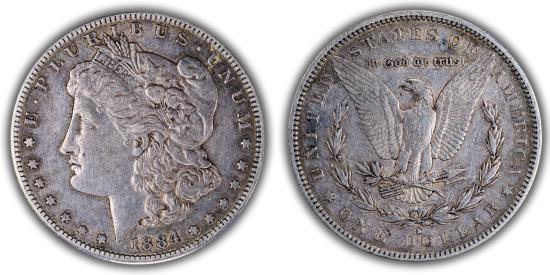 AR Dollar 38.1 mm, 26.59 g. U.S. Mint, San Francisco, CA, “Morgan” design by George T. Morgan Obv: E • PLURIBUS • UNUM, head of Liberty facing left, wearing a Phrygian cap & a headband inscribed LIBERTY, date & 13 stars below Rev: UNITED STATES OF AMERICA / * ONE DOLLAR *, bald eagle with wings displayed, holding 3 arrows and an olive branch in its claws. A small wreath surrounds the eagle. Above the eagle, the motto IN GOD WE TRUST EF-40 |