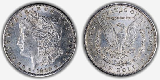 AR Dollar 38.1 mm, 26.71 g. U.S. Mint, San Francisco, CA, “Morgan” design by George T. Morgan Obv: E • PLURIBUS • UNUM, head of Liberty facing left, wearing a Phrygian cap & a headband inscribed LIBERTY, date & 13 stars below Rev: UNITED STATES OF AMERICA / * ONE DOLLAR *, bald eagle with wings displayed, holding 3 arrows and an olive branch in its claws. A small wreath surrounds the eagle. Above the eagle, the motto IN GOD WE TRUST AU-58, lustrous |