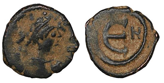 Justin II. 565-578 AD. Pentanummium. Carthage. 1.47 gr. – 13.2 mm. O:\ Diademed, draped and cuirassed bust right. R:\ Large Є; N to right. Sear 93A (Justin I); MIBE N82. aXF