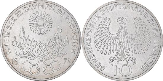| | Coin, GERMANY - FEDERAL REPUBLIC, Munich olympics, 10 Mark, 1972, Hamburg | | | Eagle above denomination, Olympic Flame, spiral symbol above, rings divide date below | | FEATURES |