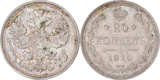 | | Coin, Russia, Nicholas II, 20 Kopeks, 1915, Saint-Petersburg, , Silver | | | Crowned double-headed imperial eagle, ribbons on crown, Crown above value and date within wreath, Struck at Petrograd without mint mark. | | FEATURES |