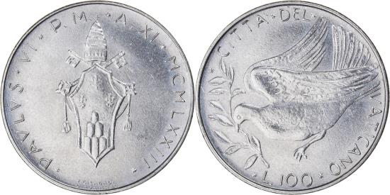 | | Coin, VATICAN CITY, Paul VI, 100 Lire, 1973, , Stainless Steel, KM:122 | | | Crowned shield, Dove in flight with olive branch | | FEATURES |