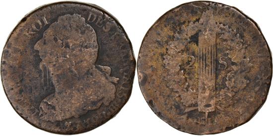| | Coin, France, Louis XVI, 2 Sols, 1792 / AN 4, Strasbourg, , Bronze | | | 2 sols français, Bust left, Liberty cap above fasces, oak wreath surrounds, LOUIS XIV ROI DES FRANCAIS <Bullet> | | FEATURES |