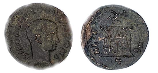 | ROMULUS, 310 AD, 1/4 FOLLES, ROME MINT. AE 3 2.1 gms, TEMPLE WITH DOMED ROOF |