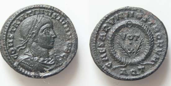 | Constantine II Aquileia, 321 AD. Æ19mm follis, 2,8g. CONSTANTINUS IUN NOB C laureate, draped, cuirassed bust right / CAESARUM NOSTRORUM around VOT V in wreath; below AQT. |