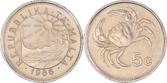 | | Coin, Malta, 5 Cents, 1986, , Copper-nickel, KM:77 | | | Republic emblem within circle, Freshwater crab (il-qobru) and value | | FEATURES |