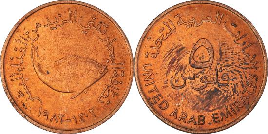 | | Coin, United Arab Emirates, 5 Fils, 1982, British Royal Mint, , Bronze | | | Value, Fish above dates | | FEATURES |