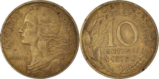 | | Coin, France, Marianne, 10 Centimes, 1979, Paris, , Aluminum-Bronze | | | Marianne, Liberty bust left, Denomination above date, grain sprig below, laurel branch at left, Without mint mark. 1991-1993 dated coins, non-Proof, exist in both coin and medal alignment., Henri Lagriffoul | | FEATURES |