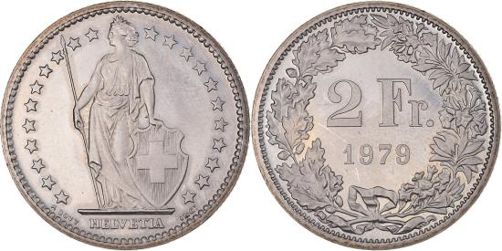 | | Coin, Switzerland, 2 Francs, 1979, Bern, Proof, , Copper-nickel, KM:21a.1 | | | Standing Helvetia with lance and shield within star border, Value within wreath | | FEATURES |