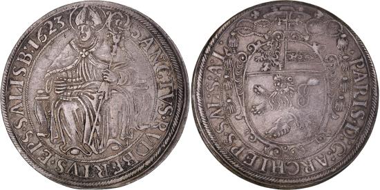 | | Bishopric of Salzburg, Paris von Lodron, Thaler, 1623, Salzburg, Silver | | | Saint Ruppert seated, facing 3/4 left, holding his episcopal crozier in his right hand and his salt barrel in his left, resting on his knee., Episcopal coat of arms of Paris von Lodron as Archbishop of Salzburg., Davenport 3497., ·PARIS·D:G:ARCHIEPS·SAL·S:A·L·, SANCTVS·RVDBERTVS·EPS·SALISB:1623 | | FEATURES |