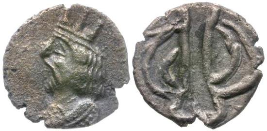 Bust left, wearing diadem and Persepolitan crown