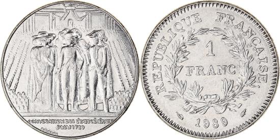 | | Coin, France, États généraux, Franc, 1989, , Nickel, KM:967 | | | États généraux, Denomination within wreath, date below, Three figure monument | | FEATURES |