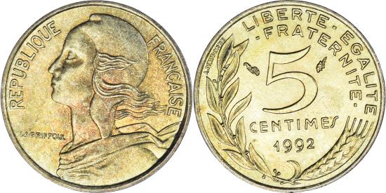 | | Coin, France, Marianne, 5 Centimes, 1992, Paris, , Aluminum-Bronze | | | Marianne, Liberty bust left, Denomination above date, grain sprig below, laurel branch at left, 1991-1993 dated coins, non-Proof exist in both coin and medal alignment., Henri Lagriffoul | | FEATURES |