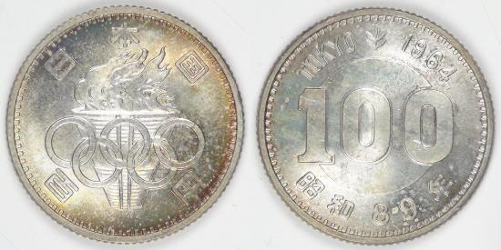 Obv: Olympic rings in front of torch, “State of Japan” above and “100 Yen” below