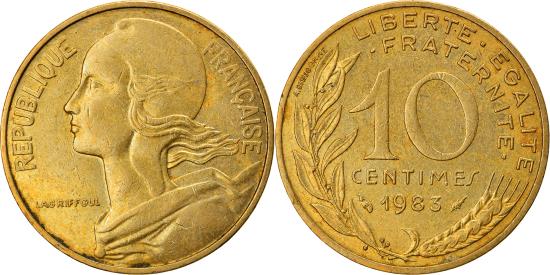| | Coin, France, Marianne, 10 Centimes, 1983, Paris, , Aluminum-Bronze | | | Marianne, Liberty bust left, Denomination above date, grain sprig below, laurel branch at left, Without mint mark. 1991-1993 dated coins, non-Proof, exist in both coin and medal alignment., Henri Lagriffoul | | FEATURES |