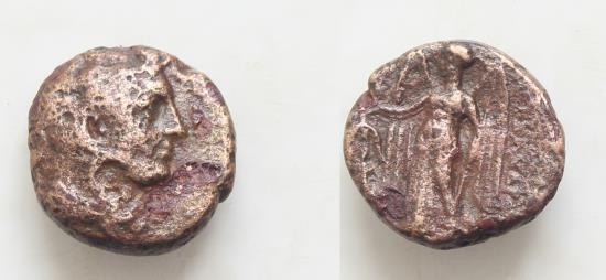 | SELEUKID EMPIRE. Seleukos I Nikator. Second satrapy and kingship, 312-281 BC. Æ 16mm, 3,8g. Susa mint. Struck circa 300-298 BC. Head of Alexander III right, wearing elephant skin / Nike standing left, holding wreath and stylis; anchor to left AΛEΞANΔPOY. SC 189; cf. Price 3875–7; HGC 9, 102. Earthen dark brown surfaces, compact flan, some roughness and marks. Very Fine. Very Rare, only two in CoinArchives (Heidelberger Münzhandlung 64, lot 251, CLASSICAL NUMISMATIC GROUP, INC., ELECTRONIC AUCTION 514, LOT 191, |