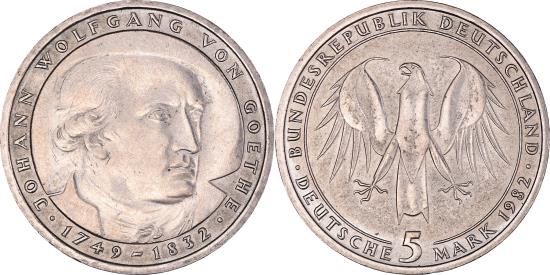| | Coin, GERMANY - FEDERAL REPUBLIC, 5 Mark, 1982, Munich, Germany, | | | Eagle above denomination, date at right, Head right, dates below | | FEATURES |