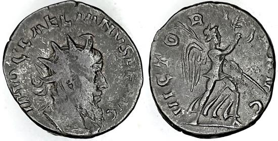 | TCRIS-370, LAELIANUS, AR 3.46 gm, Obv: Radiate, curated bust right, IMP C LAELIANVS PF AVG. Rev: Around design, VICTORIA AVG, Victory advancing to right holding wreath and palm. Moguntiacum mint. ex Noble 3849 11/07. Weakly struck obverse. AD 268. c-4, RIC-9 S-1111, VERY RARE! VF. |
