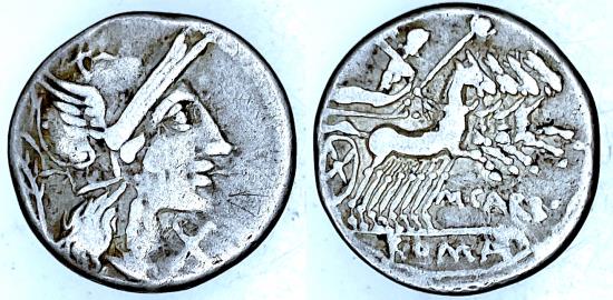 | TCRRS-3552, ROMAN REPUBLIC, M CARBO, AR, Obv: Head of Roma, X in front of the neck, Rev: Jupiter in Quadriga right, ROMA in ex. M CARB below horse hooves. Bac Italy 472, Syd 423, Craw 276/1, VF |