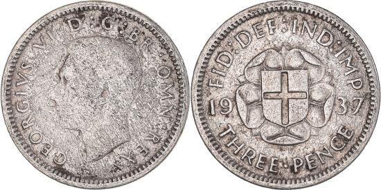 | | Coin, Great Britain, George VI, 3 Pence, 1937, , Silver, KM:848 | | | Head left, St. George shield on Tudor rose divides date, T. H. Paget | | FEATURES |