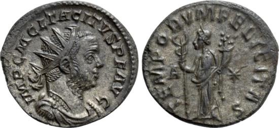 Obv: IMP C M CL TACITVS P F AVG. Radiate, draped and cuirassed bust right. Rev: TEMPORVM FELICITAS / A - (star). Felicitas standing left, holding caduceus and cornucopia.