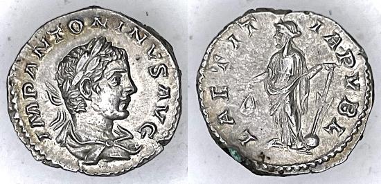 TCRIS-372, AR 2.70 gm. 18.5 mm Denarius, ELAGABALUS, Obv: Laur.,draped and cuir. bust right. Rev: LAETITIA PVBL standing left holding wreath and rudder on globe. 219-220 AD. Rome mint. AU
