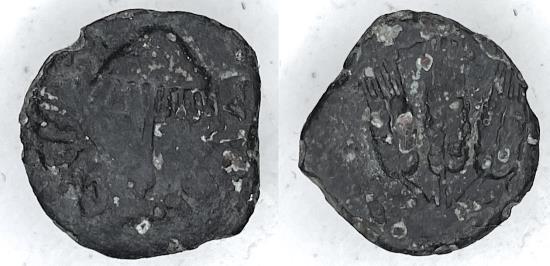 TCJBB-40, AE 2.39 gm 17 mm. HERODIAN KINGDOM, JUDAEA, AGRIPPA, Obv: Open Umbrella. Rev: 3 three HEADS of BARLEY. 27 BC to 69 AD. Coin requires cleaning (soaking in distilled water) to reduce adhered material. EF