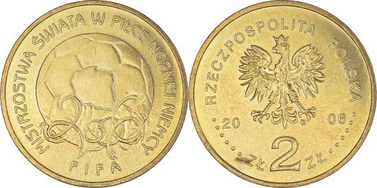| | Coin, Poland, 2 Zlote, 2006, Warsaw, , Brass, KM:606 | | | National arms, Large soccer ball with fancy linked date 2006, RZECZPOSPOLITA POLSKA | | FEATURES |
