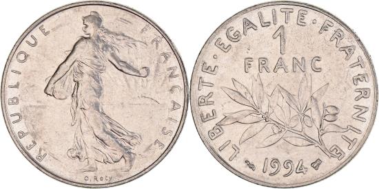 | | Coin, France, Semeuse, Franc, 1994, Paris, , Nickel, KM:925.1 | | | Semeuse, The Seed Sower, Laurel branch divides denomination and date, Without mint mark., Louis Oscar Roty | | FEATURES |